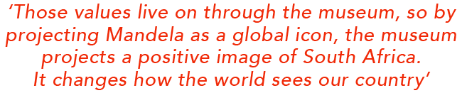 Tyhulu admits to feeling the weight of that responsibility. ‘Madiba was a different breed,’ he says. ‘As a museum, we always have to keep in touch with what he stood for. How do we translate his values into an organisation like ours, which has so many different personalities? How do our different backgrounds come together to help in disseminating Madiba’s values – values like ubuntu, integrity, innovation, stewardship, service excellence and development and learning – to the general public? It’s a complex task but everybody’s enjoying it.’