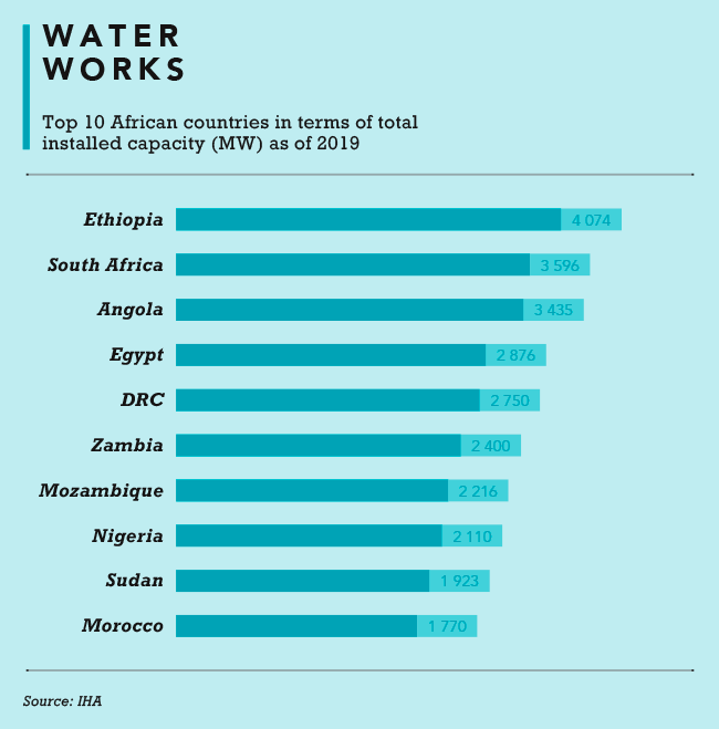 The continent has more than 37 GW of installed hydropower capacity, notes the IHA. Ethiopia, at 4 074 MW, tops the list of African countries with installed capacity exceeding 2 GW, followed by South Africa, Angola, Egypt, the DRC, Zambia, Mozambique and Nigeria.