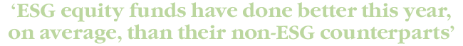 2020 marked ‘a pivotal year for ESG investing’, according to Moody’s, which noted a record 140% rise of inflows into ESG products for that year. And while the global market slump didn’t spare ESG funds, they have performed less badly than conventional funds. ‘The rapid growth in ESG funds coincided with a bull market that ended in 2022, making this lull a test for portfolio managers and investors alike,’ Bloomberg reported in June 2022. ‘ESG equity funds have done better this year, on average, than their non-ESG counterparts. All are negative, in line with the broad market sell-off, but ESG funds are down less than the others, despite typically tech-heavy, energy-light portfolios.’