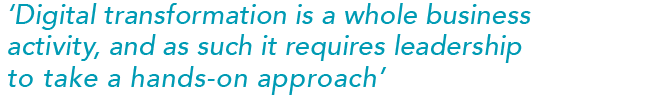 The key lies not only in leadership buy-in, but in direct leadership involvement – with CEOs, chief technology officers and the entire leadership team driving that organisational change. ‘Digital transformation is a whole business activity, and as such it requires leadership to take a hands-on approach. In today’s world of digital, there is no business as usual. Everything is up for grabs as digitally fluent disruptors make their way into every industry, eating away at the margins of slower, less-responsive businesses. You need to constantly reassess your position so that you can refine, adjust or replace as needed. As such, digitally enabled business-model innovation has to become a core competency at an executive level,’ she says.