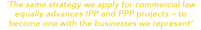 ‘Venturing into PPP and IPP transactions brought us close to government and public entities in commercial and corporate transaction,’ says Ledwaba. ‘The same strategy we apply for commercial law equally advances PPP and IPP projects – that being to become one with the businesses we represent, by finding suitable legal solutions, and identifying the resources and support required, be it in project-finance transactions or restructuring state-owned enterprises, including privatisation, litigation, administrative and constitutional law advice. It has also meant extending our motto “a habit of excellence” to every aspect of business.