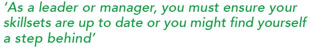 Kowalik echoes this sentiment. ‘One of the biggest issues today is that we live in uncertainty, particularly in South Africa. What we are seeing is that, with the downgrades from various ratings agencies, there is a lot of change. This change is affecting organisations in a huge way in terms of productivity and changing market conditions, where companies really need to look at how they’re going to be competitive in this current economy. As a leader or manager, you must ensure your skillsets are up to date or you might find yourself a step behind.’