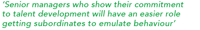 Page concurs. ‘Top leadership should live and demonstrate the value of talent development and drive this emphasis throughout the organisation. Senior managers who demonstrate their commitment to talent development through the initiatives they attend or participate in will have an easier role getting subordinates to emulate behaviour.