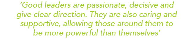 ‘Good leaders, in my opinion, are passionate, decisive and give clear direction. They are also caring and supportive, allowing those around them to be more powerful than themselves. The most important aspect for me is to recognise the contribution each player adds to the organisation, from cleaning staff to chief executive. To encourage my team, the A+ team, to strive to be A++.