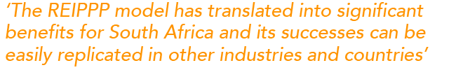 From an investor’s perspective, he says, several criteria have been crucial to the success of the REIPPP. ‘Clarity around the legal and regulatory framework and a transparent, competitive procurement regime have been essential in providing certainty around the procurement process and sanctity of contracts.
