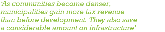 According to Geffen, as well as cultivating both a residential and commercial audience, mixed-use developments have the power to attract an immense amount of interest and foot traffic for commercial clients, compared to standalone stores. ‘Municipalities, and therefore cities, benefit from the increase in property-tax revenue. As communities become denser, municipalities gain more tax revenue than before development. They also save a considerable amount on infrastructure costs, like roads and sewers, when serving compact development instead of large-lot subdivisions.’