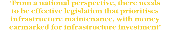Frost & Sullivan’s Ngonyama calls for a co-ordinated effort from national governments, municipalities and cities. ‘From a national perspective, there needs to be effective legislation that prioritises infrastructure maintenance, with money earmarked for infrastructure investment,’ she says.