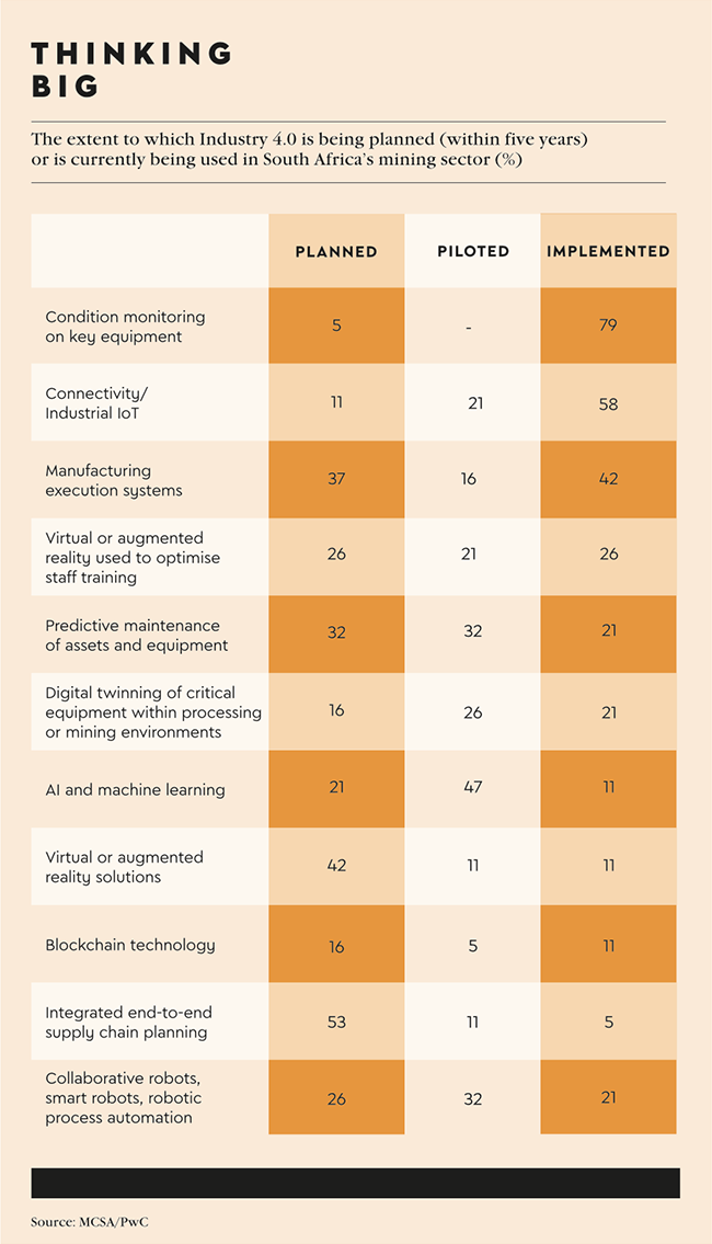 Environmental and social concerns play an important role in the adoption of new tech in mining, and the leading mining companies have embedded ESG in their innovation strategy. Interestingly, a 2021 study on digital transformation, by the MCSA and PwC, revealed that some South African mining companies consider themselves digital champions and innovators that will pilot new technologies without waiting for others to prove it first. The study says that, in fact, all South African mines are by their very nature innovative and tech-savvy, simply by virtue of the ‘hard rock, seismicity, extreme depth and the conditions under which we mine’.