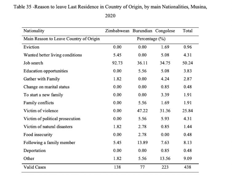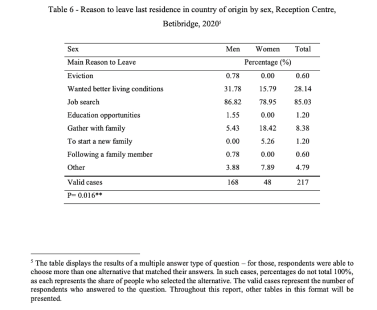 For most migrants, Beitbridge was a transit site en route to South Africa. The main reasons they gave for leaving their countries of origin were to search for jobs and for better living conditions.